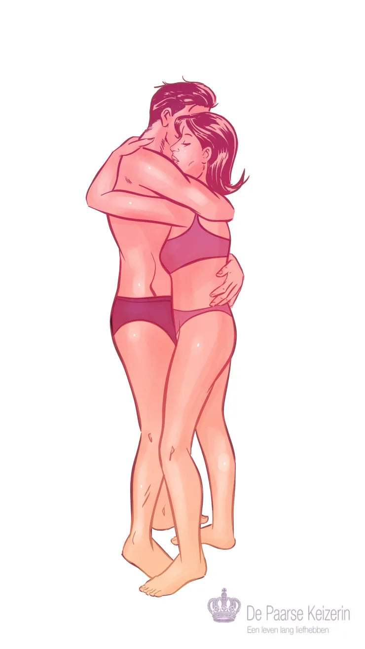 Ga tegen over elkaar staan, loop naar elkaar toe en sla de armen om elkaar heen. Ontspan het bekken en kantel het naar voren zodat de bekkens elkaar raken. Leun ook met de buiken tegen elkaar aan. Houd de knieën lichtjes gebogen. Ontspan uw lichaam steeds meer en geef u aan de omhelzing over. Ga na een paar minuten op de ademhaling van de partner letten en probeer dit ritme over te nemen. Lukt dat niet meteen? Helemaal niet erg, dat kan ook een volgende keer. Ontspanning en genieten van elkaar staat centraal.