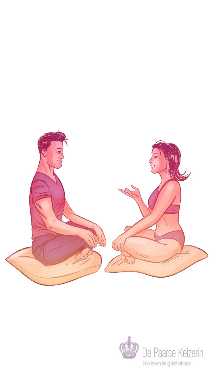 U kunt deze oefening gewoon met de kleren aan doen. Ga lekker zitten, ontspan. Kijk in de ogen van uw partner en focus hierbij op het linkeroog van uw partner, dit is het "ontvangende" oog.